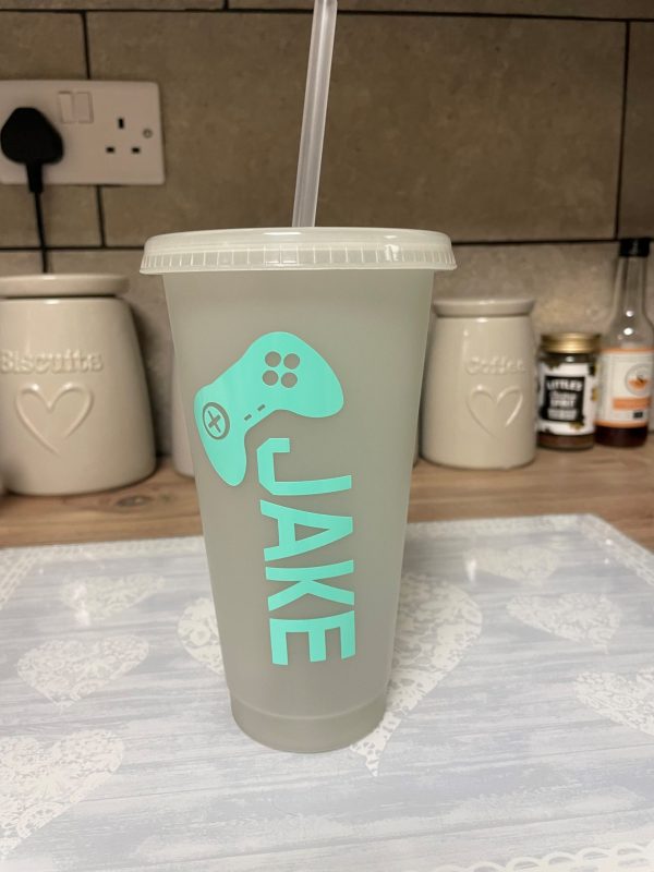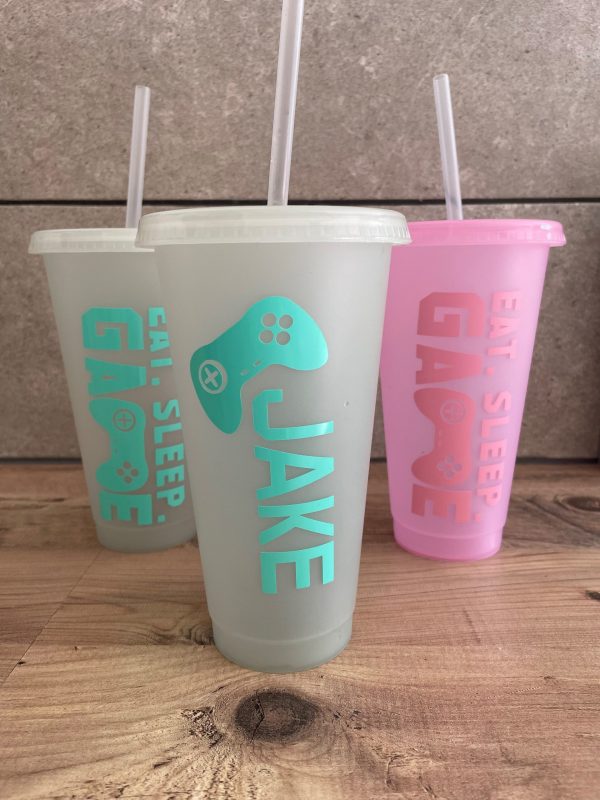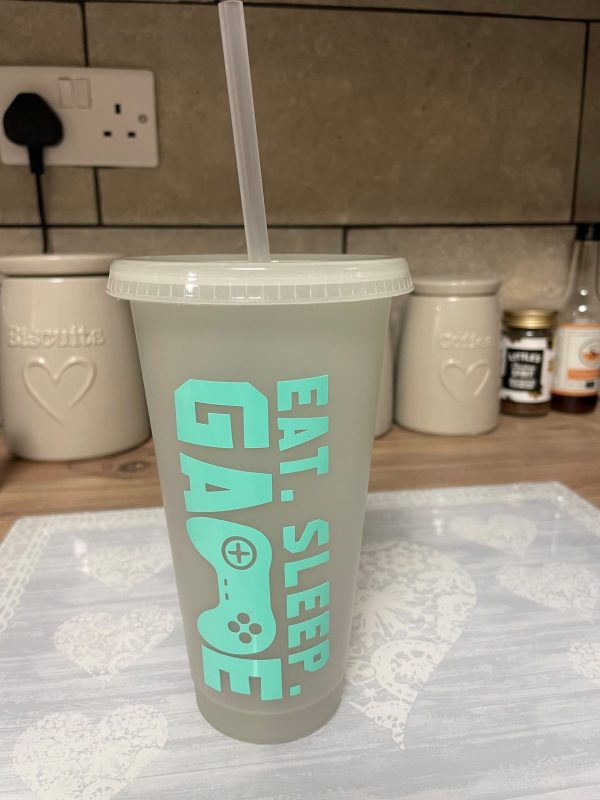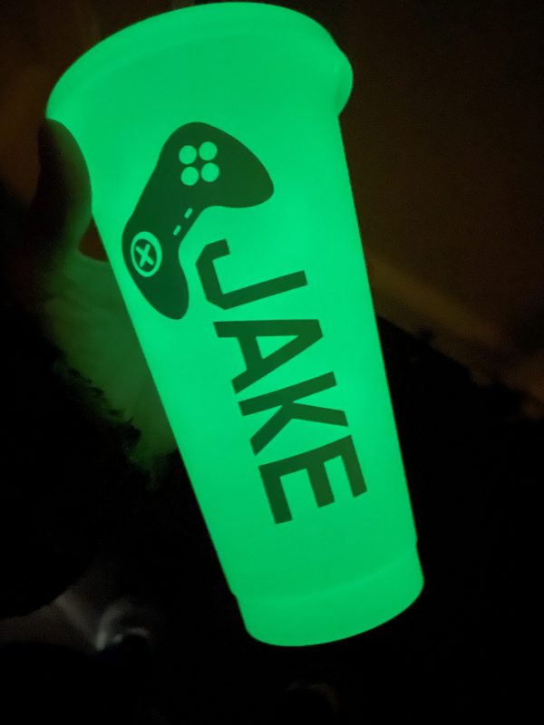 Clear glow in the dark reusable cup decorated with my ‘eat, sleep, game’ design in mint green coloured vinyl. This cup glows green in the dark. This cup can be personalised with a name of your choice. Reusable plastic cup is BPA free.