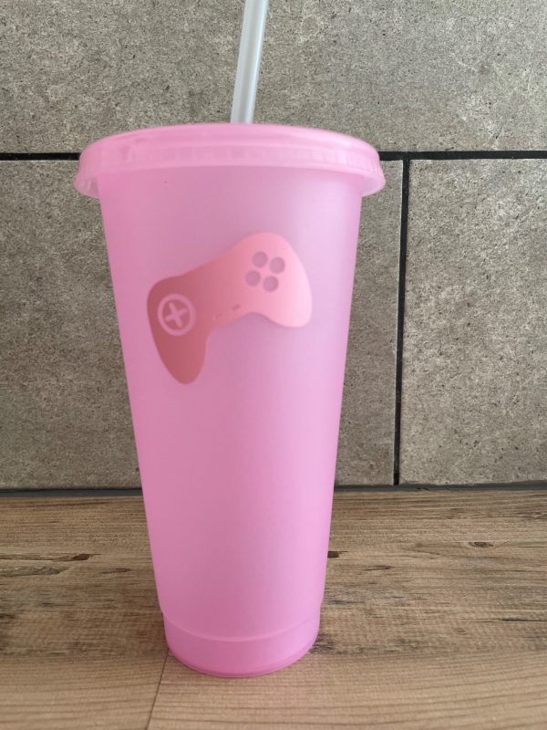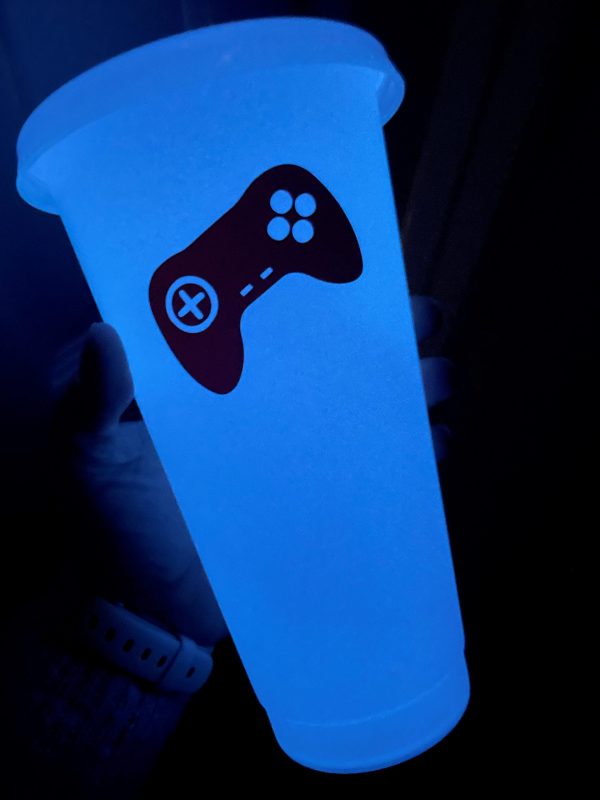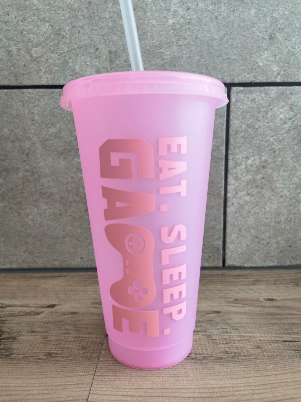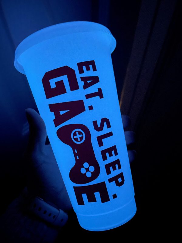Pale pink glow in the dark reusable cup decorated with my ‘eat, sleep, game’ design in pale pink coloured vinyl. This cup glows blue in the dark. This cup can be personalised with a name of your choice. Reusable plastic cup is BPA free.
