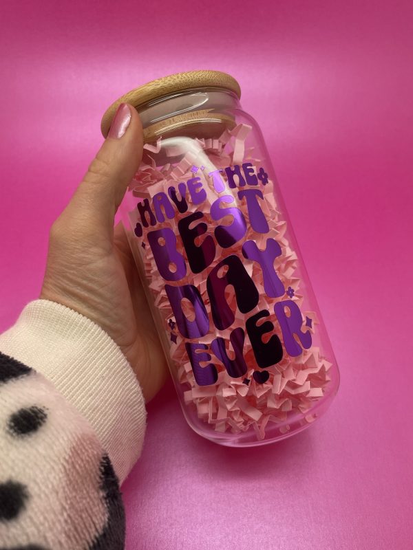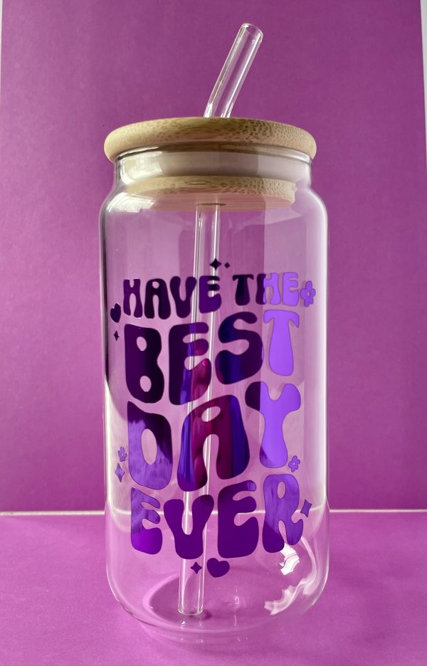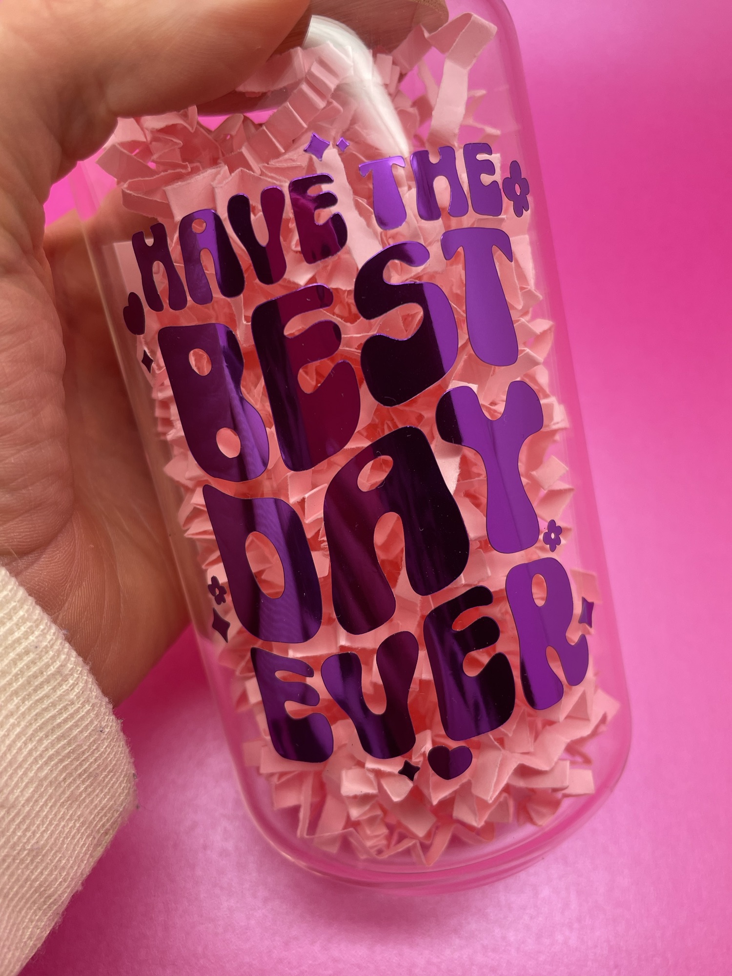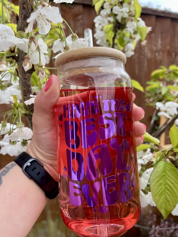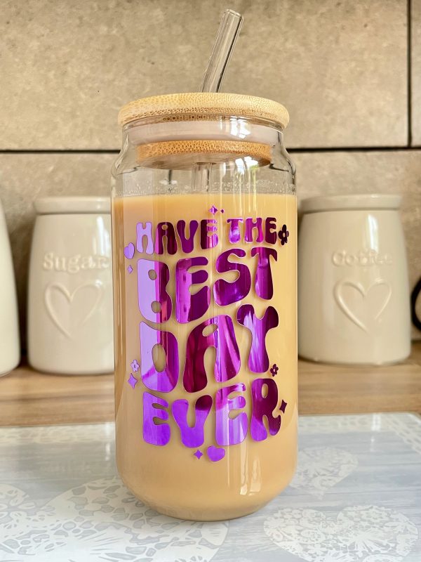 Spread positivity with our ‘Have the Best Day Ever’ affirmation glass can! These feature the design in our super eye catching purple mirror chrome vinyl. They are perfect for both iced coffee and summer drinks ????…i personally fill mine with rum and coke????…..not in the mornings????
