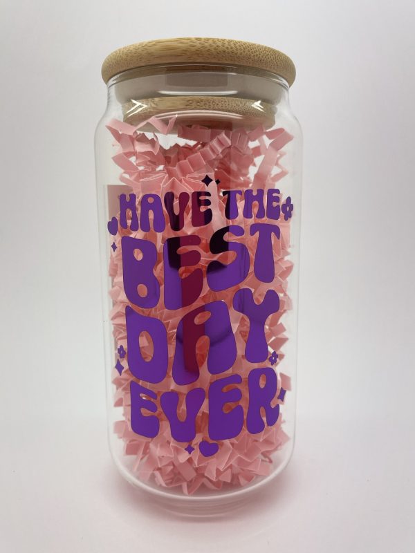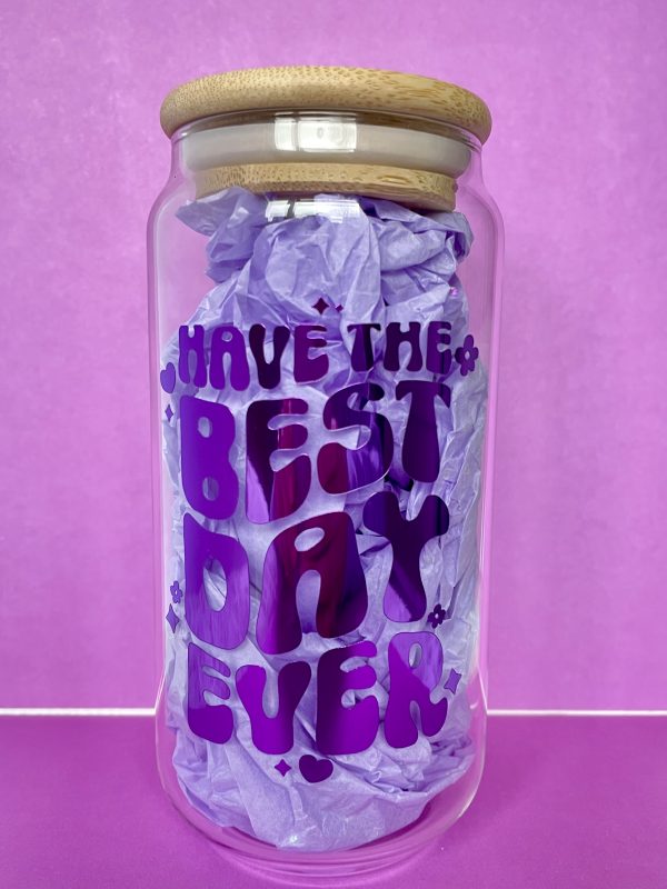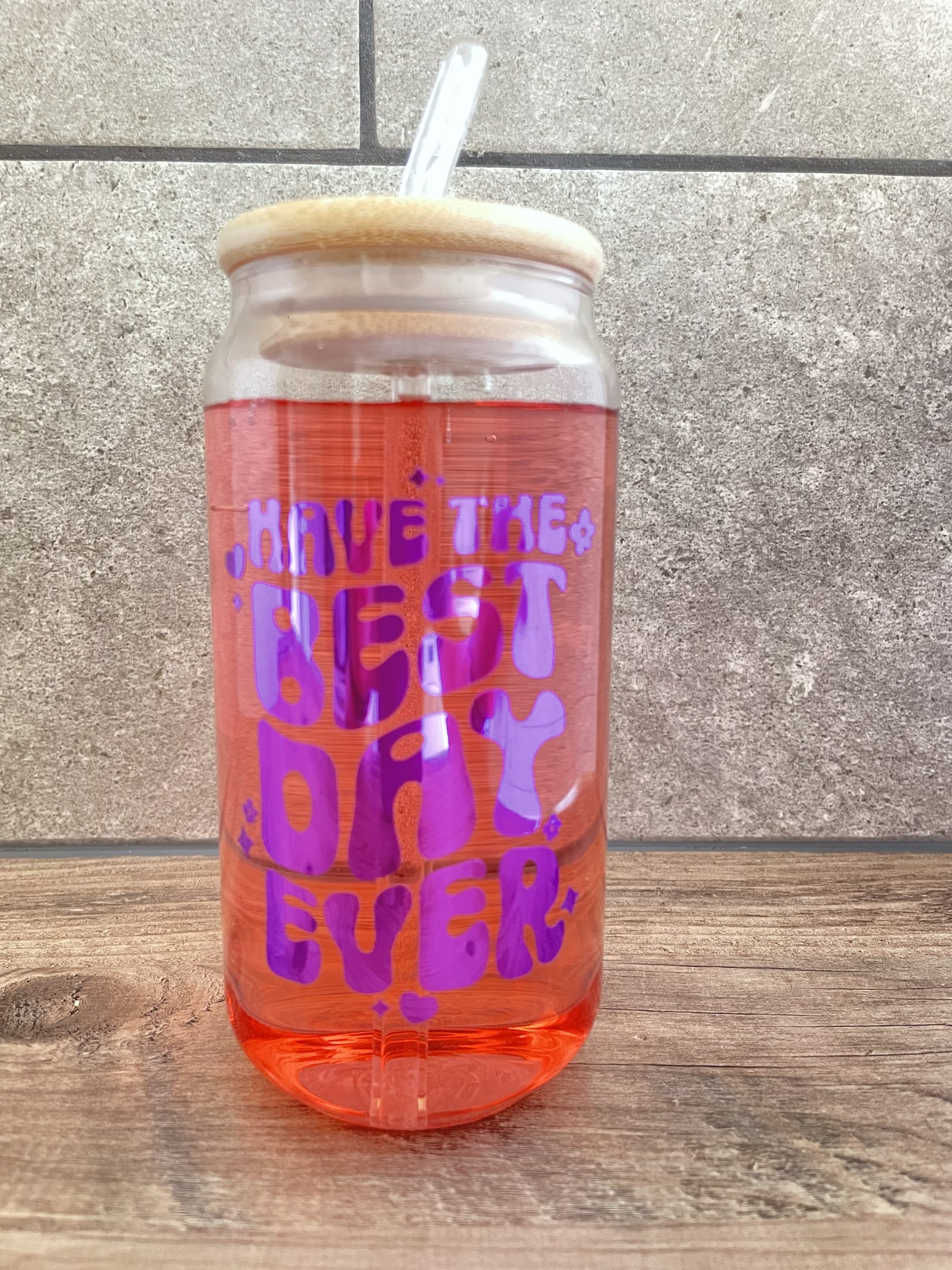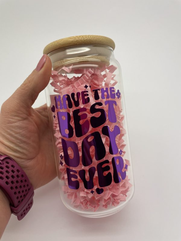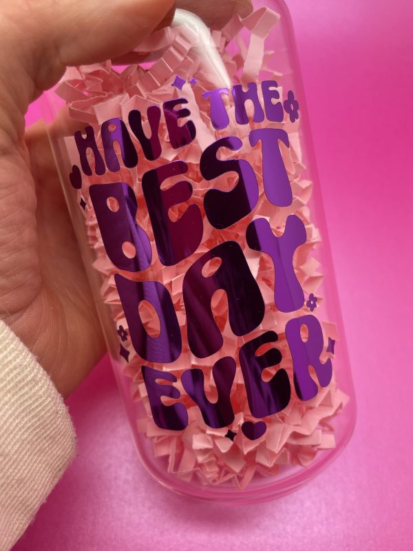 Spread positivity with our ‘Have the Best Day Ever’ affirmation glass can! These feature the design in our super eye catching purple mirror chrome vinyl. They are perfect for both iced coffee and summer drinks ????…i personally fill mine with rum and coke????…..not in the mornings????