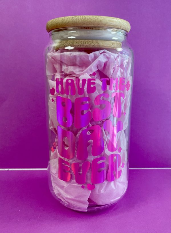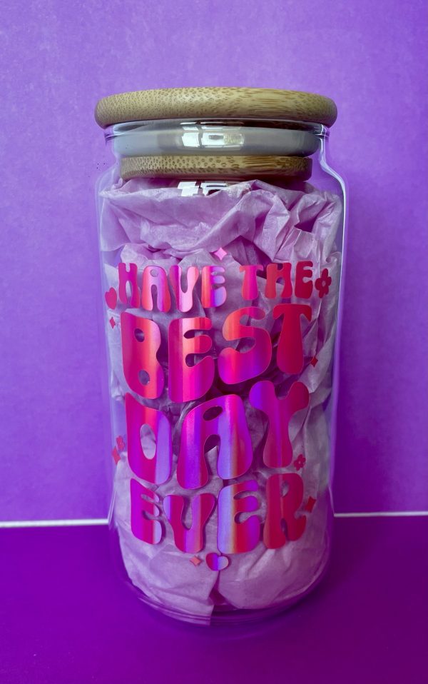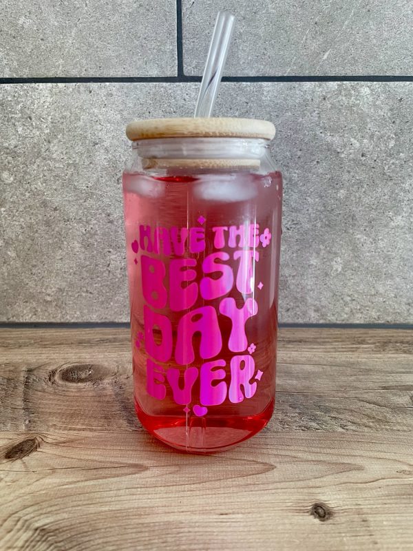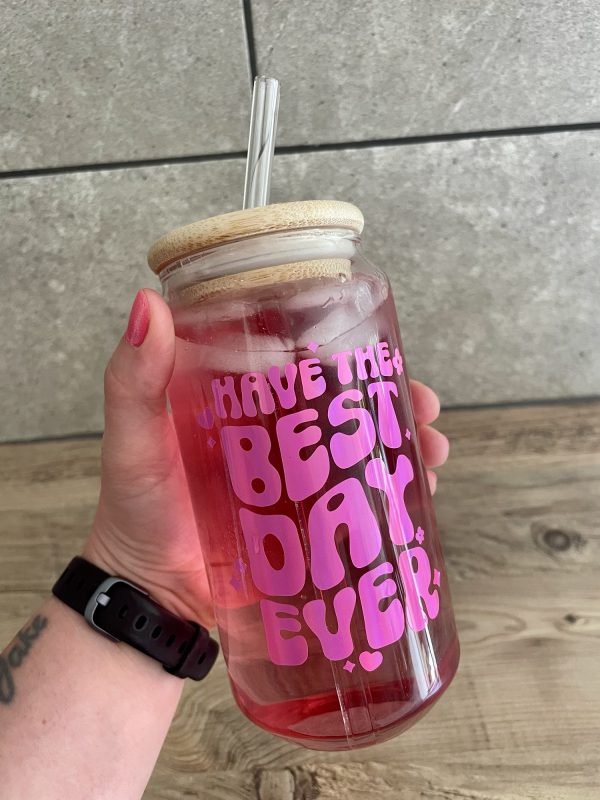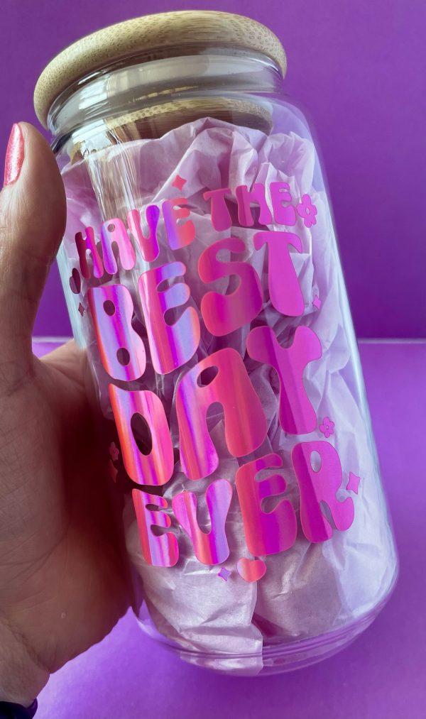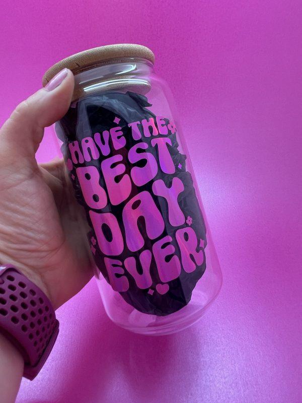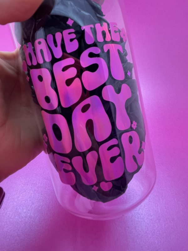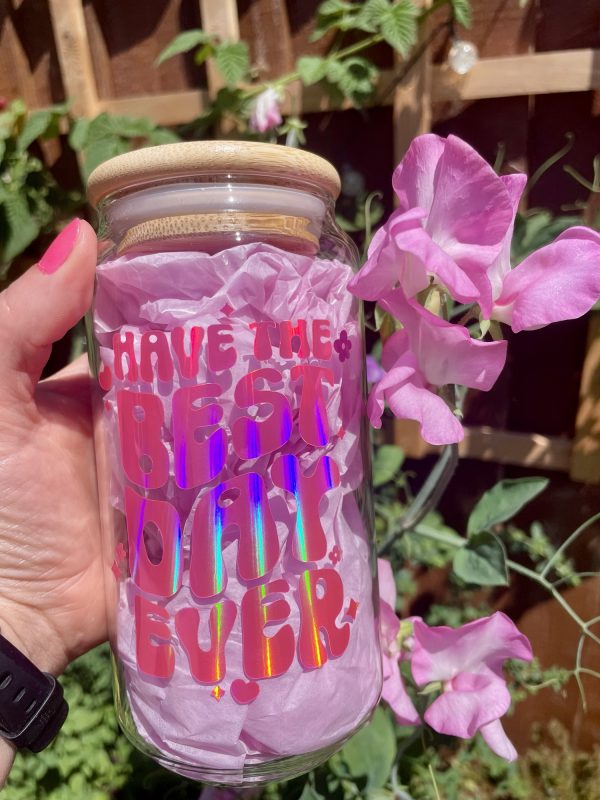 Spread positivity with our ‘Have the Best Day Ever’ affirmation glass can! These feature the design in our super eye catching pink rainbow holographic vinyl. They are perfect for both iced coffee and summer drinks ????…i personally fill mine with rum and coke????…..not in the mornings????