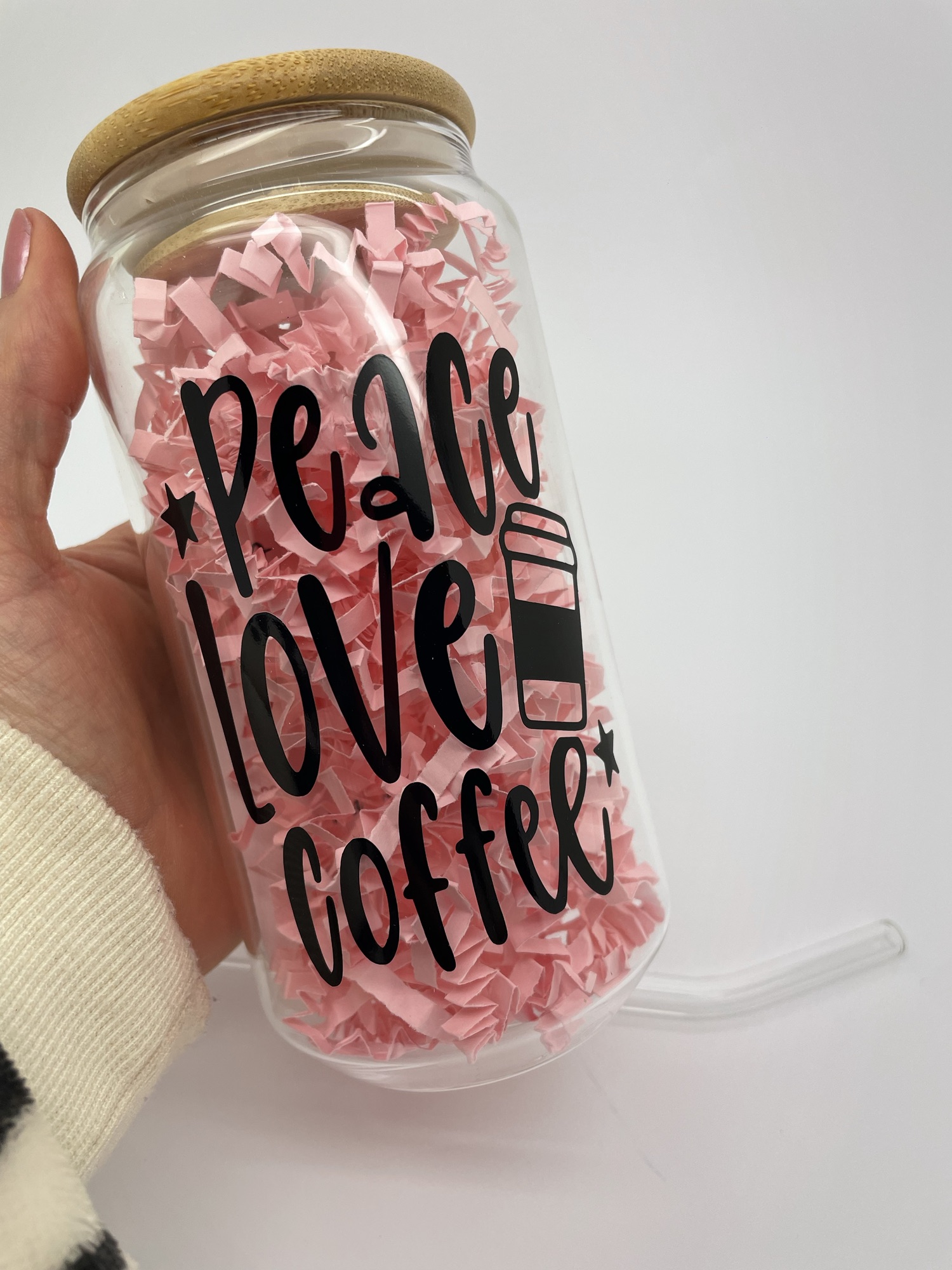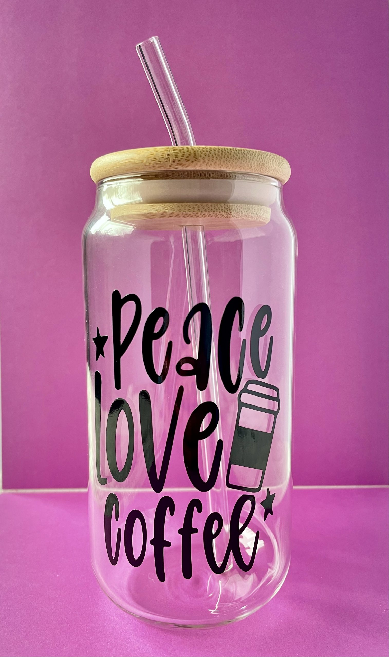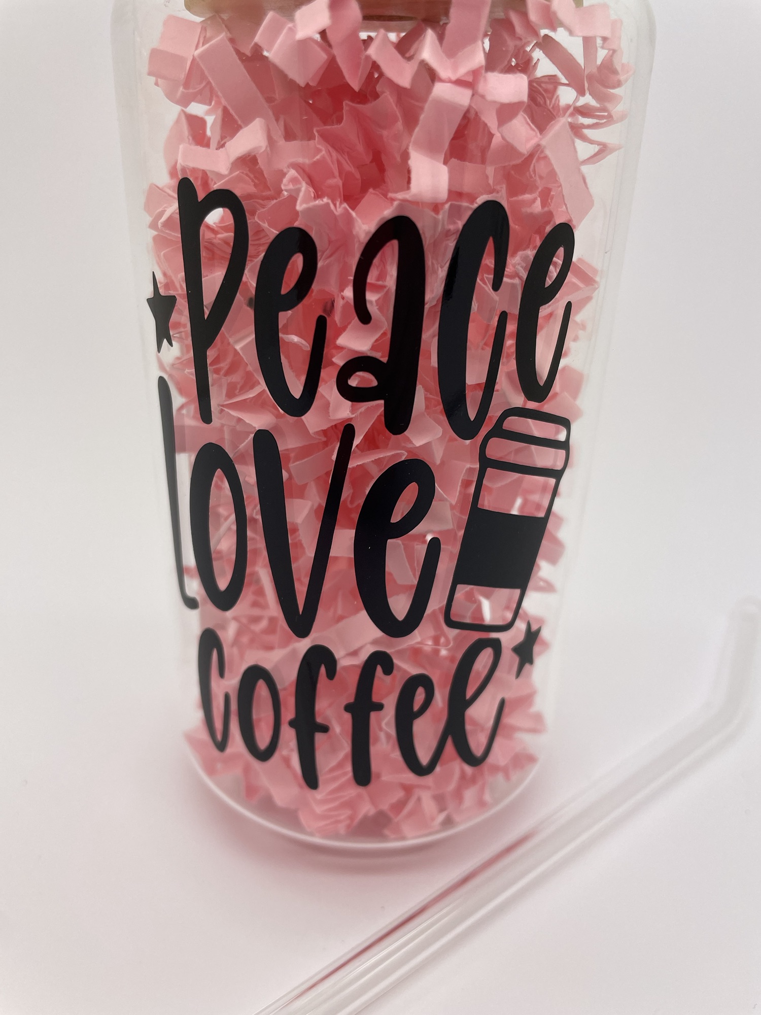 Are you a coffee lover? Do you need caffeine to function? Sip your iced Coffee in style with our ‘Peace, Love, Coffee’ beer can glass.