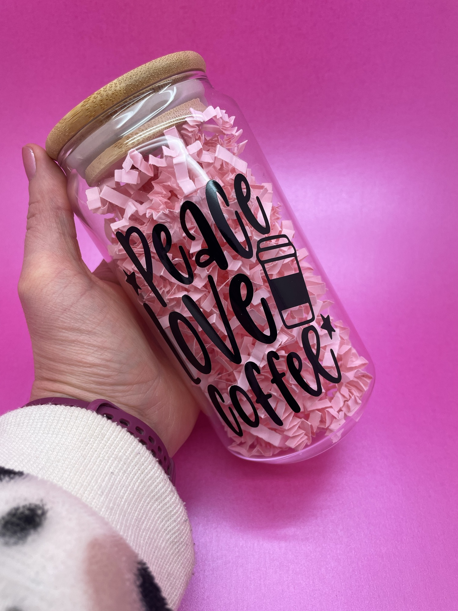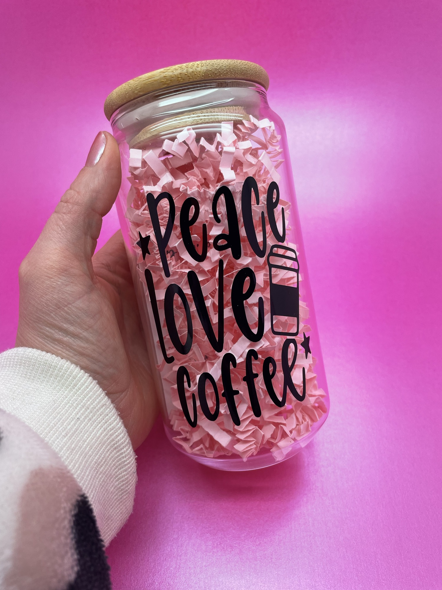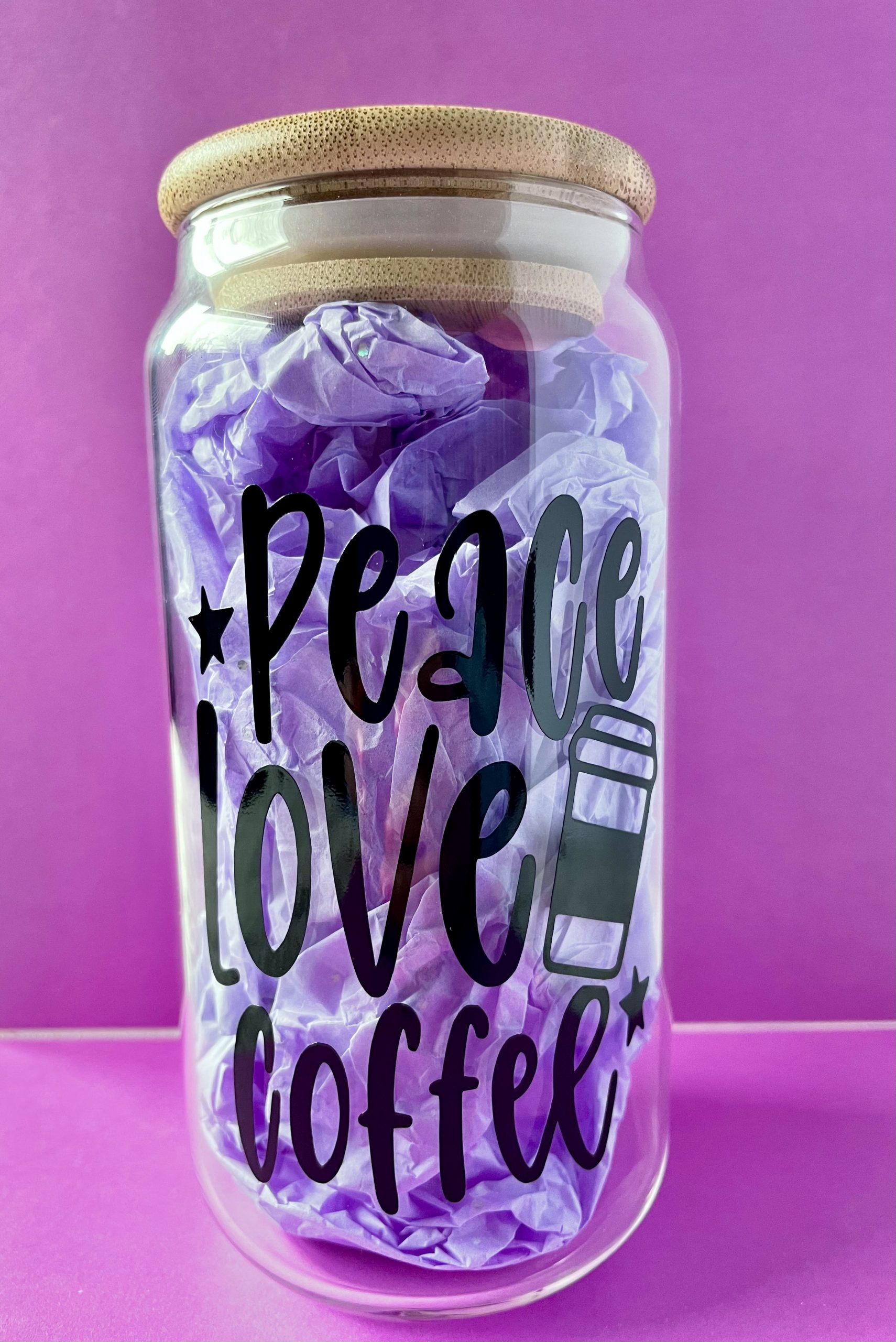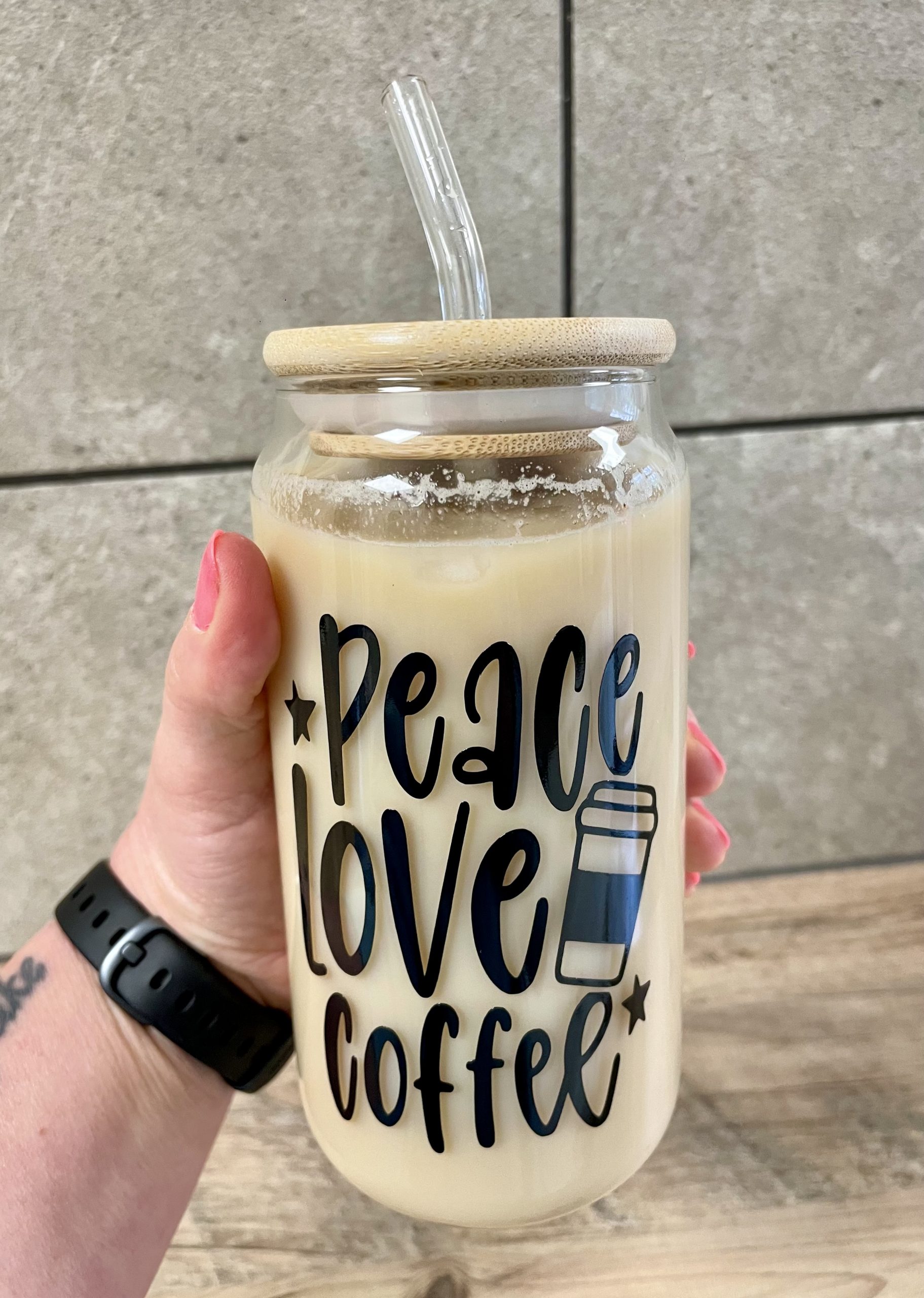 Are you a coffee lover? Do you need caffeine to function? Sip your iced Coffee in style with our ‘Peace, Love, Coffee’ beer can glass.