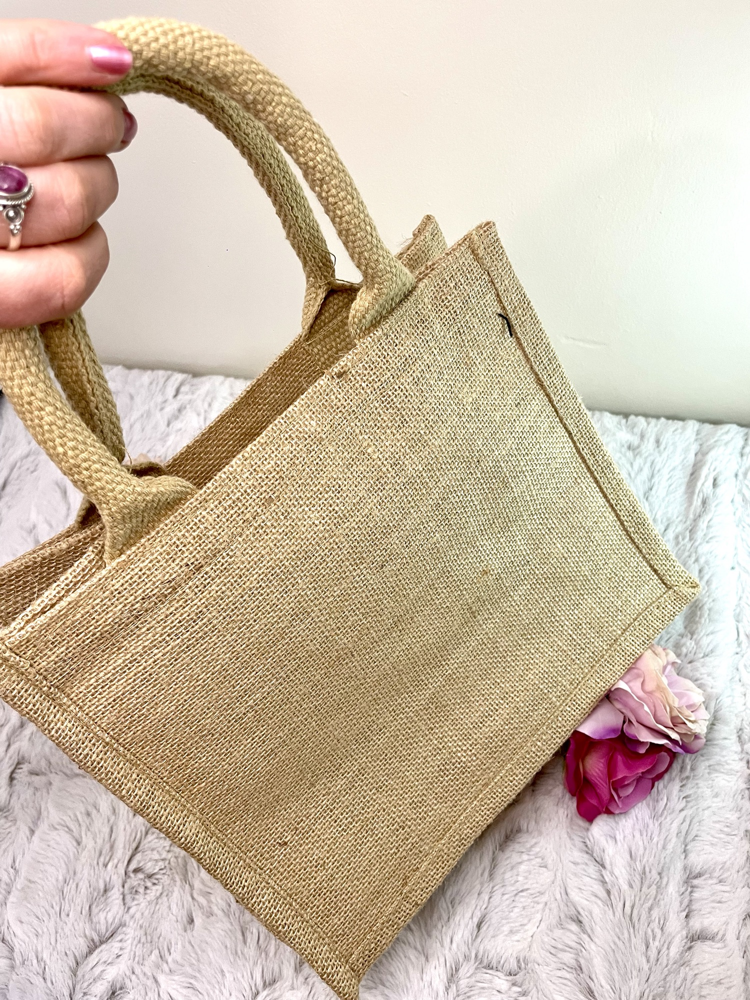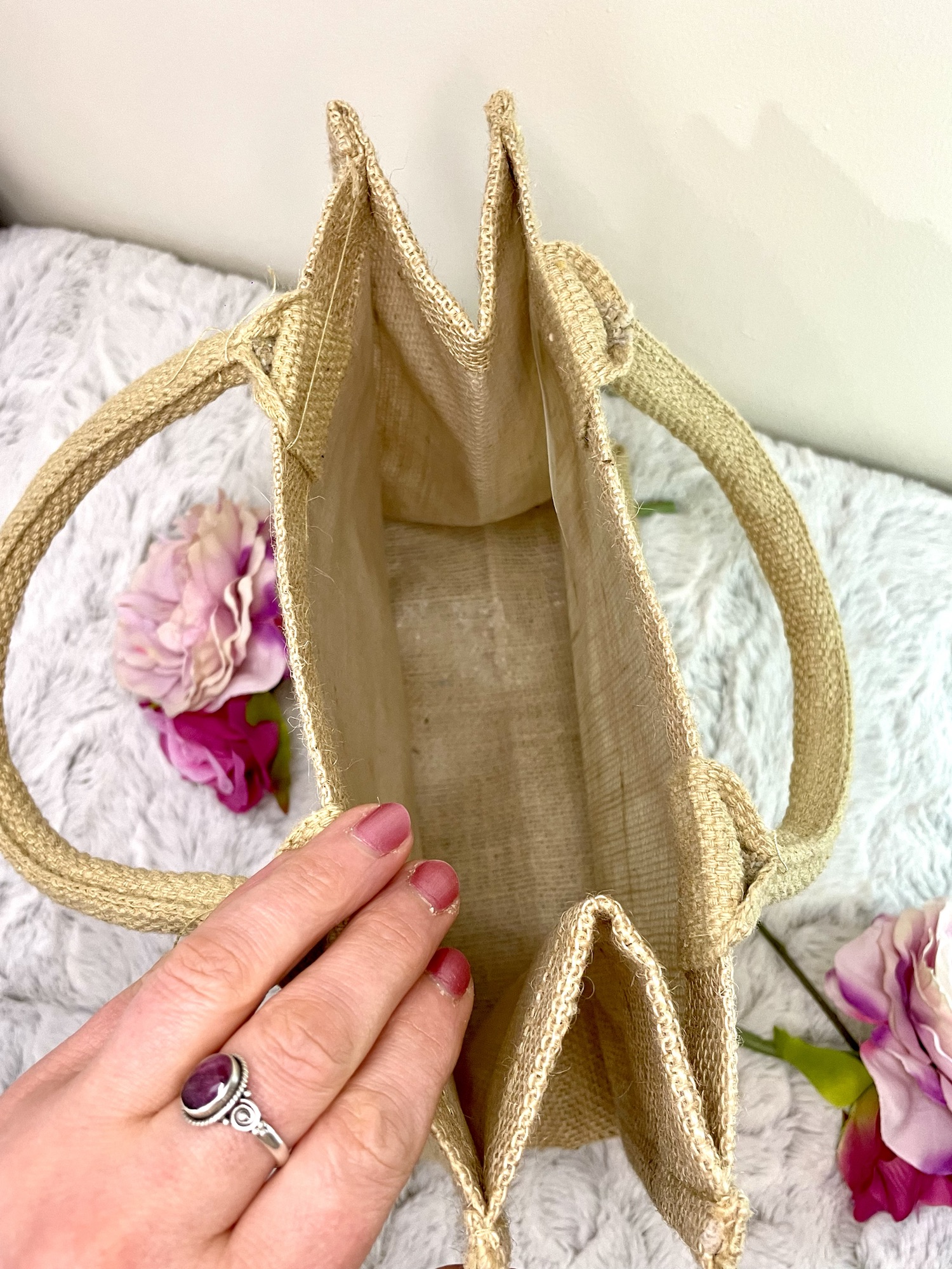 These cotton pocket jute bags not only look super cute but they are also eco friendly. Jute is one of the worlds strongest natural fibres and also one of the most sustainable. They measure approximately 26x22x14cm and has a 6 litre capacity. It also features a 12cm tubular handle,